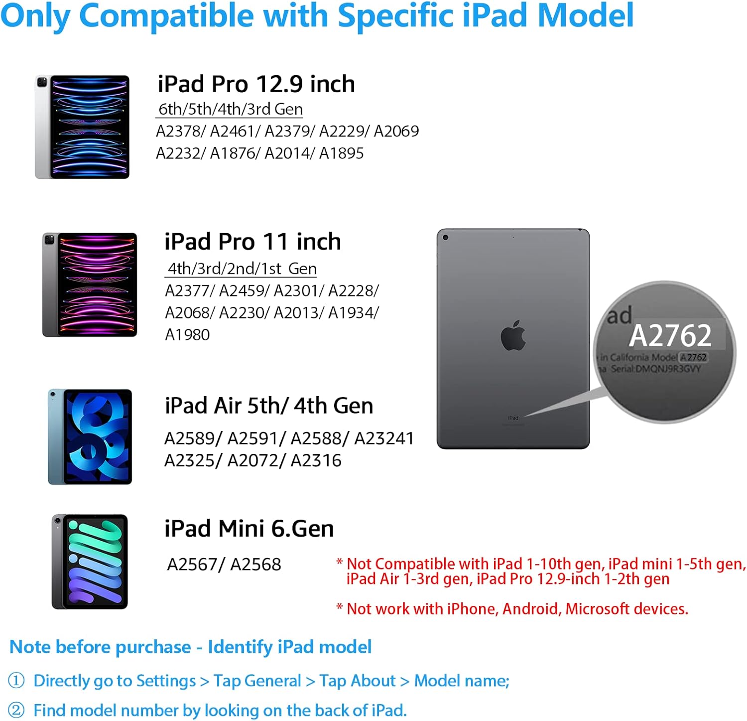 | Compatible Devices | ONLY Compatible with iPad Air 5th/4th Gen, iPad Pro 12.9-inch 6th/5th/4th/3th Gen, iPad Pro 11-inch 4th/3rd/2nd/1st Gen, iPad mini 6th Gen |
